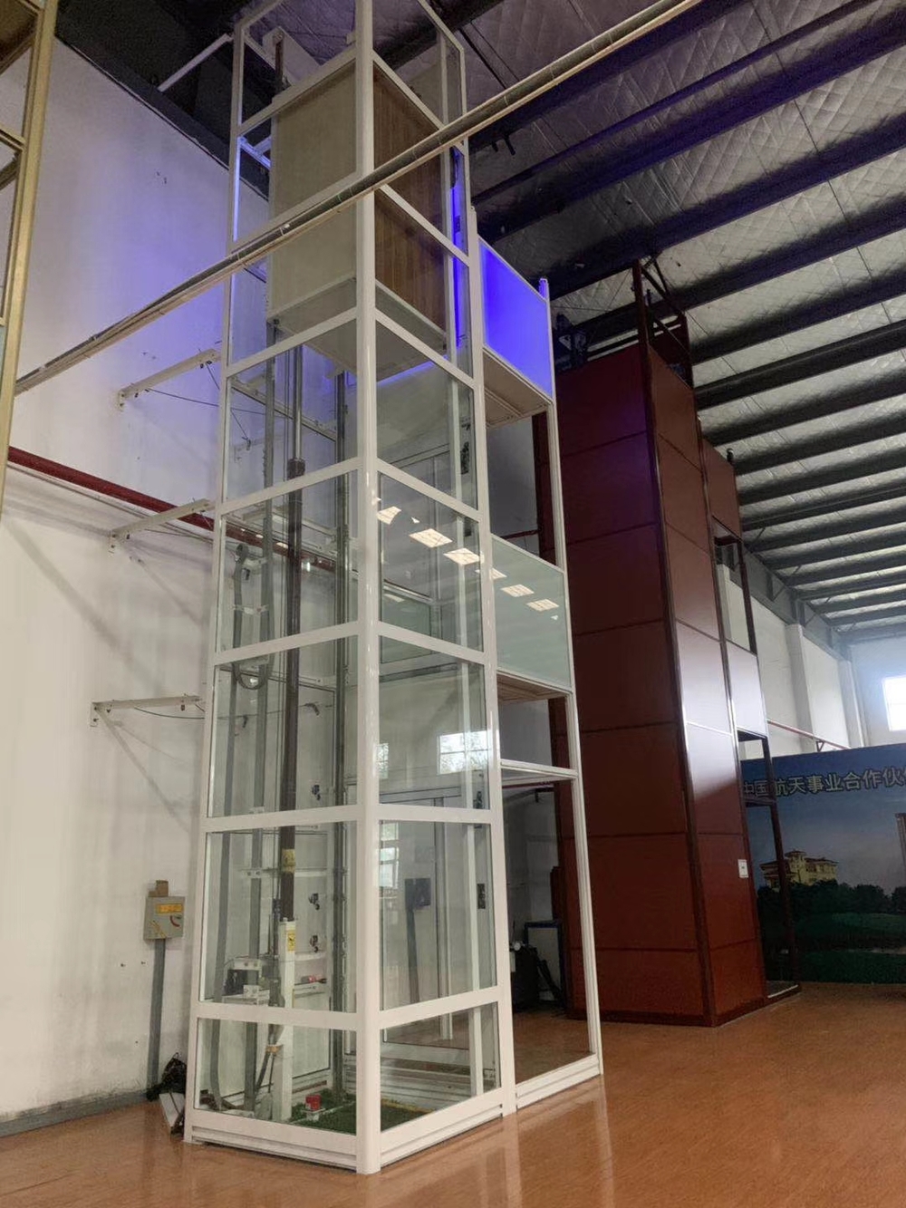 井道和轎廂壁至少有同一側(cè)透明,乘客可觀看轎廂外景物的電梯。主要安裝于賓館、商場、高層辦公樓場合,有一面或幾面的井道壁和轎廂壁同側(cè)是透明材料,乘客在乘坐電梯時(shí),可以觀看轎廂外的景物。